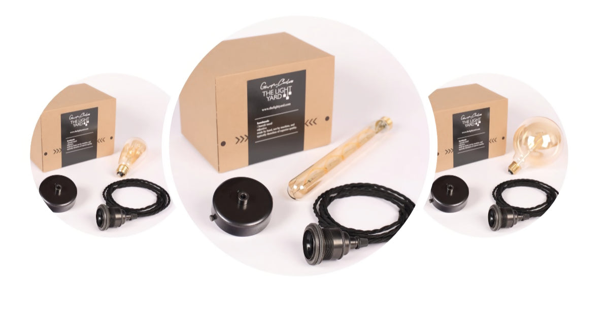 Each pendant light comes with 2 metres of black fabric cord, a ceiling rose and decorative LED light bulb.