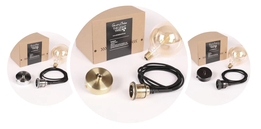 Each pendant light comes with 2 metres of black fabric cord, a ceiling rose and decorative LED light bulb.